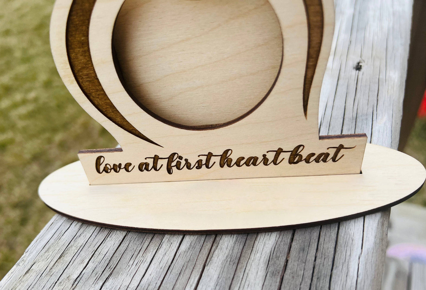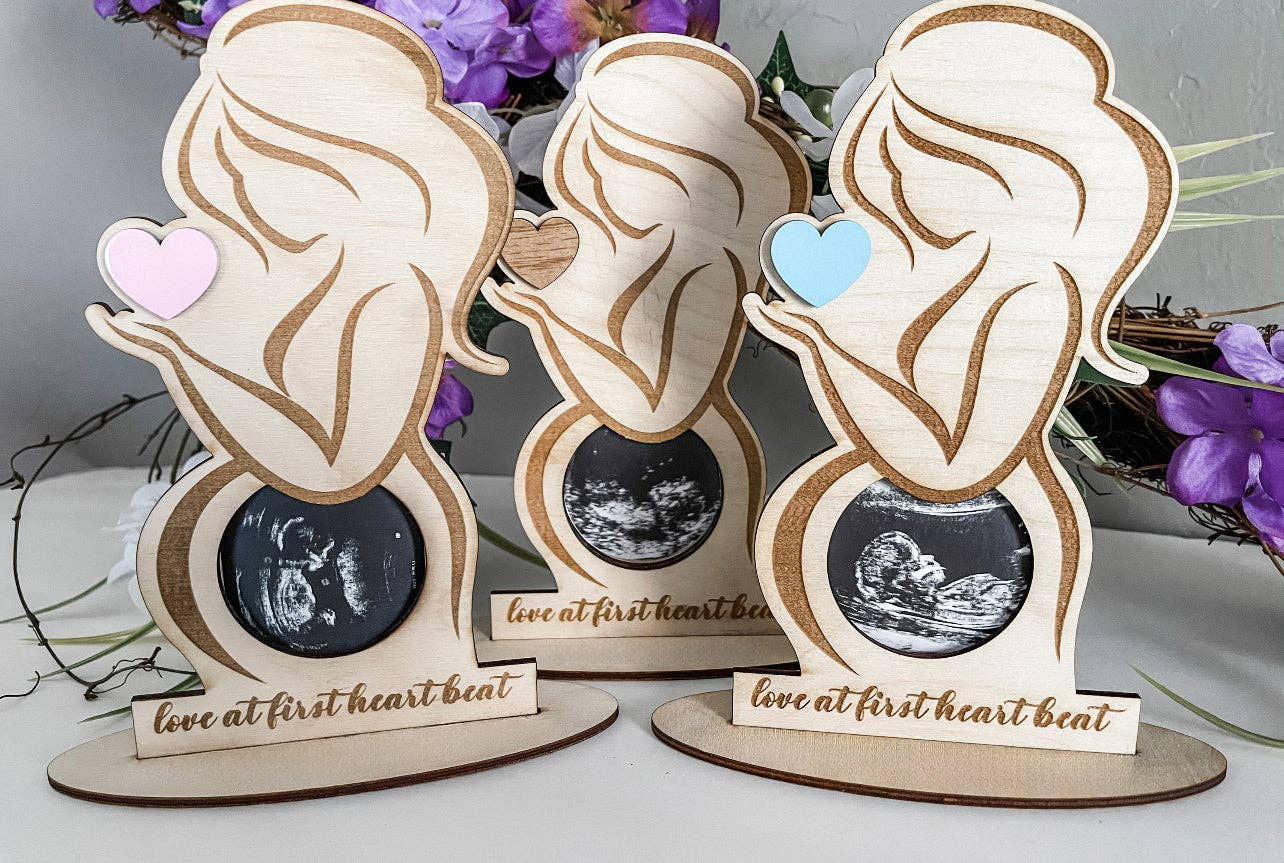Capture the precious moment of your baby's first photo with our Baby Sonogram Frame! This handcrafted wooden frame features a heartwarming design of a woman holding a pink heart, perfect for displaying your sonogram. Cherish the memories with this special keepsake.
