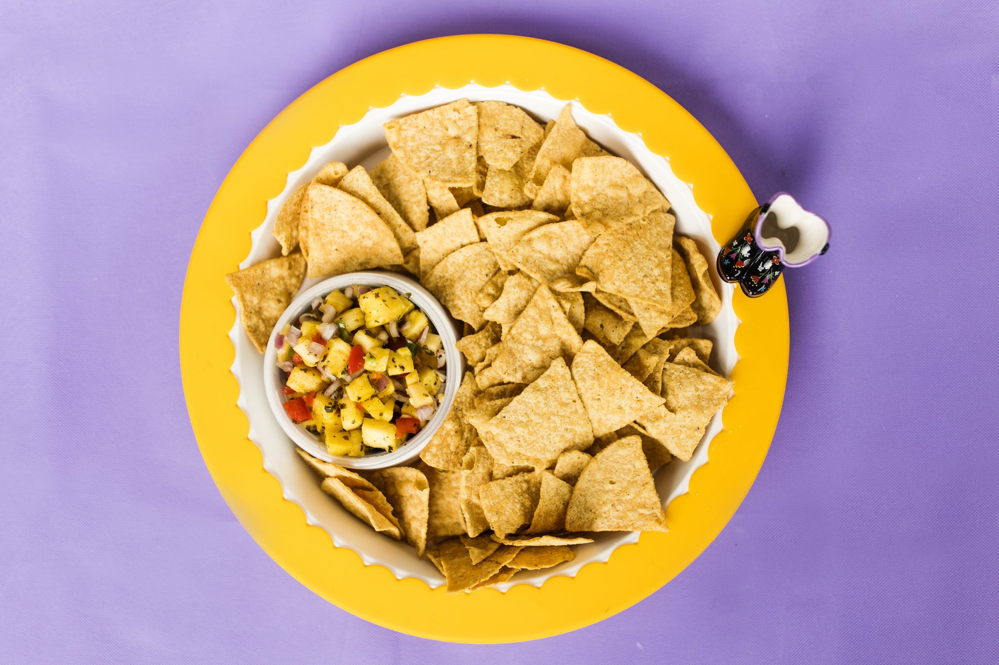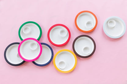 The colorful bands add a pop of color to the melamine chip & dip platter. Great to mix and match with your favorite minis!