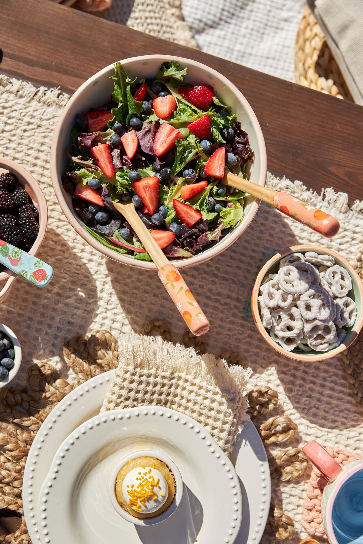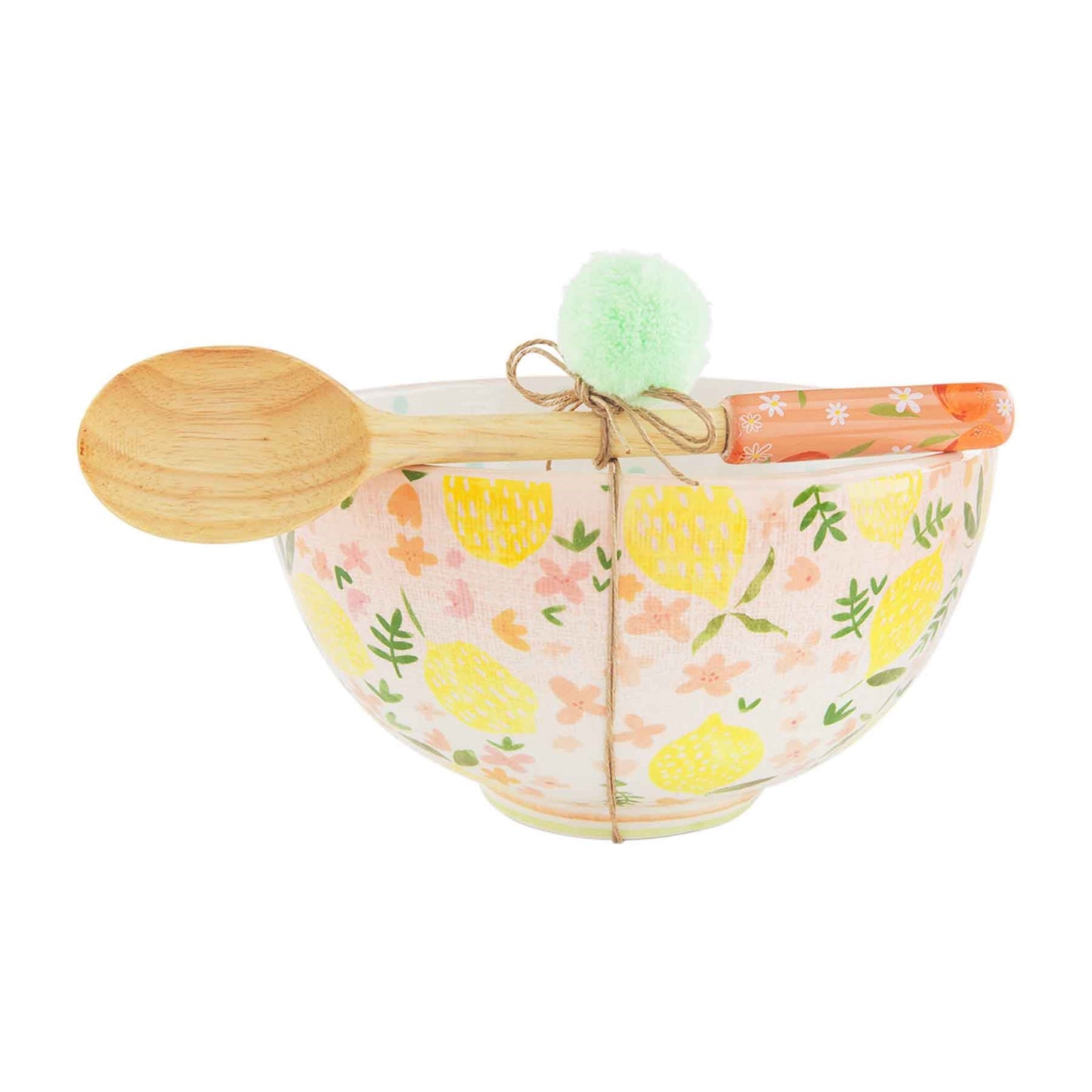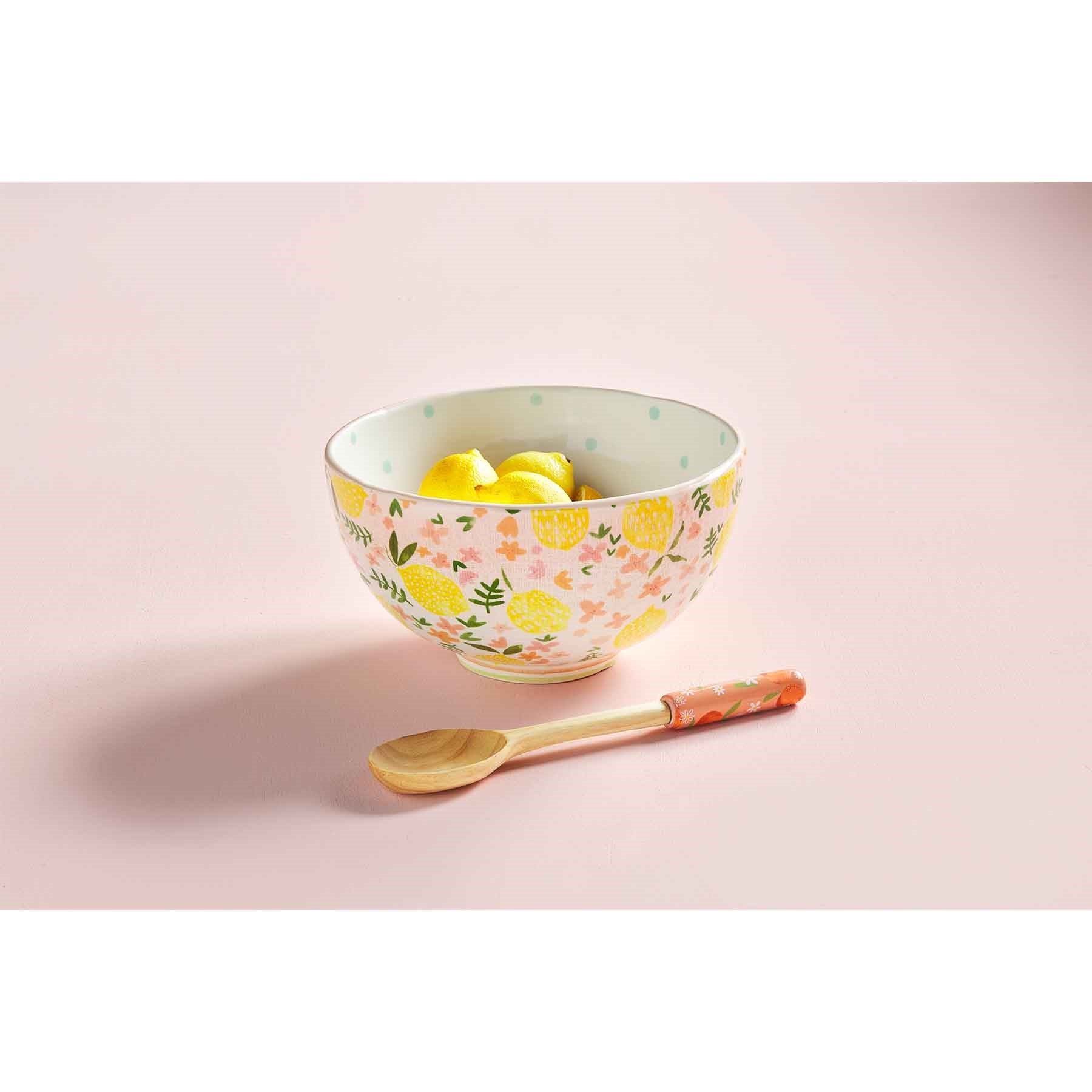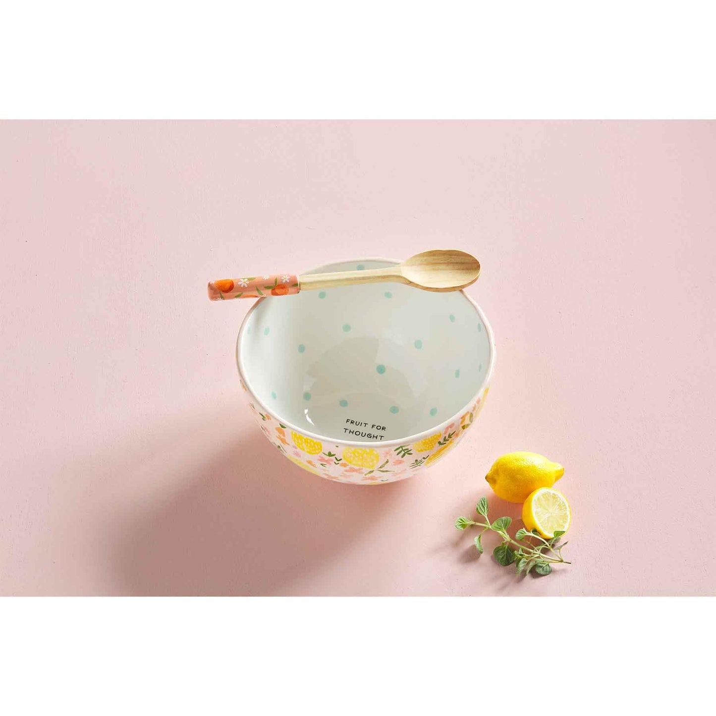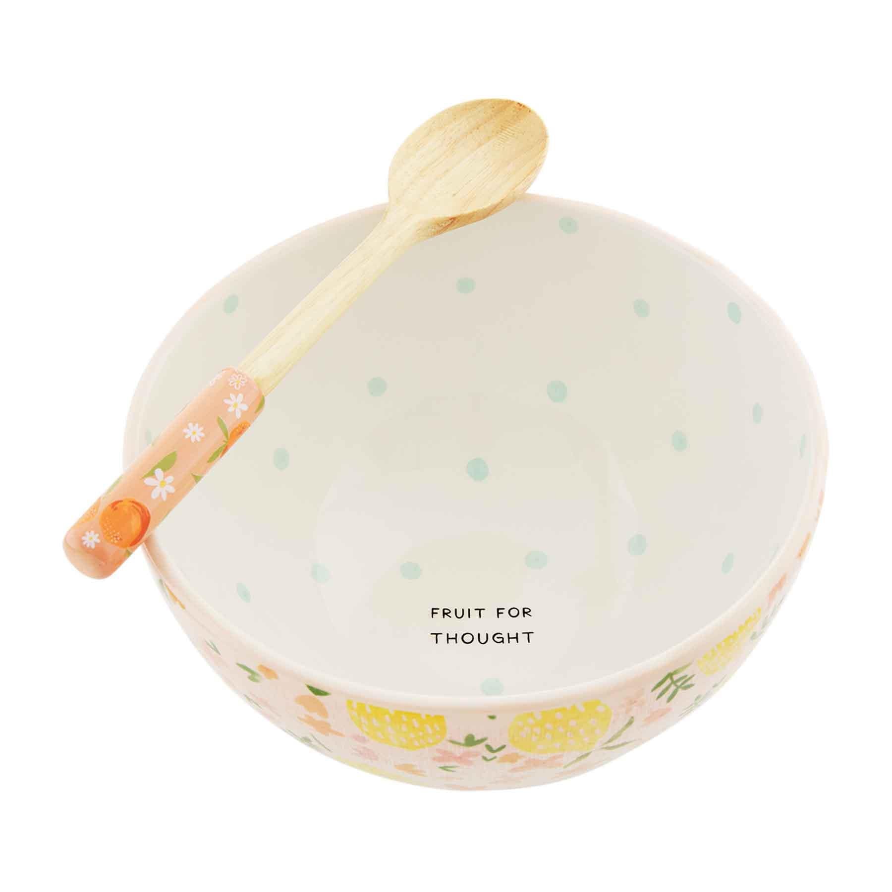 2-piece set. Hand-painted ceramic bowl. Comes with wood and ceramic spoon.