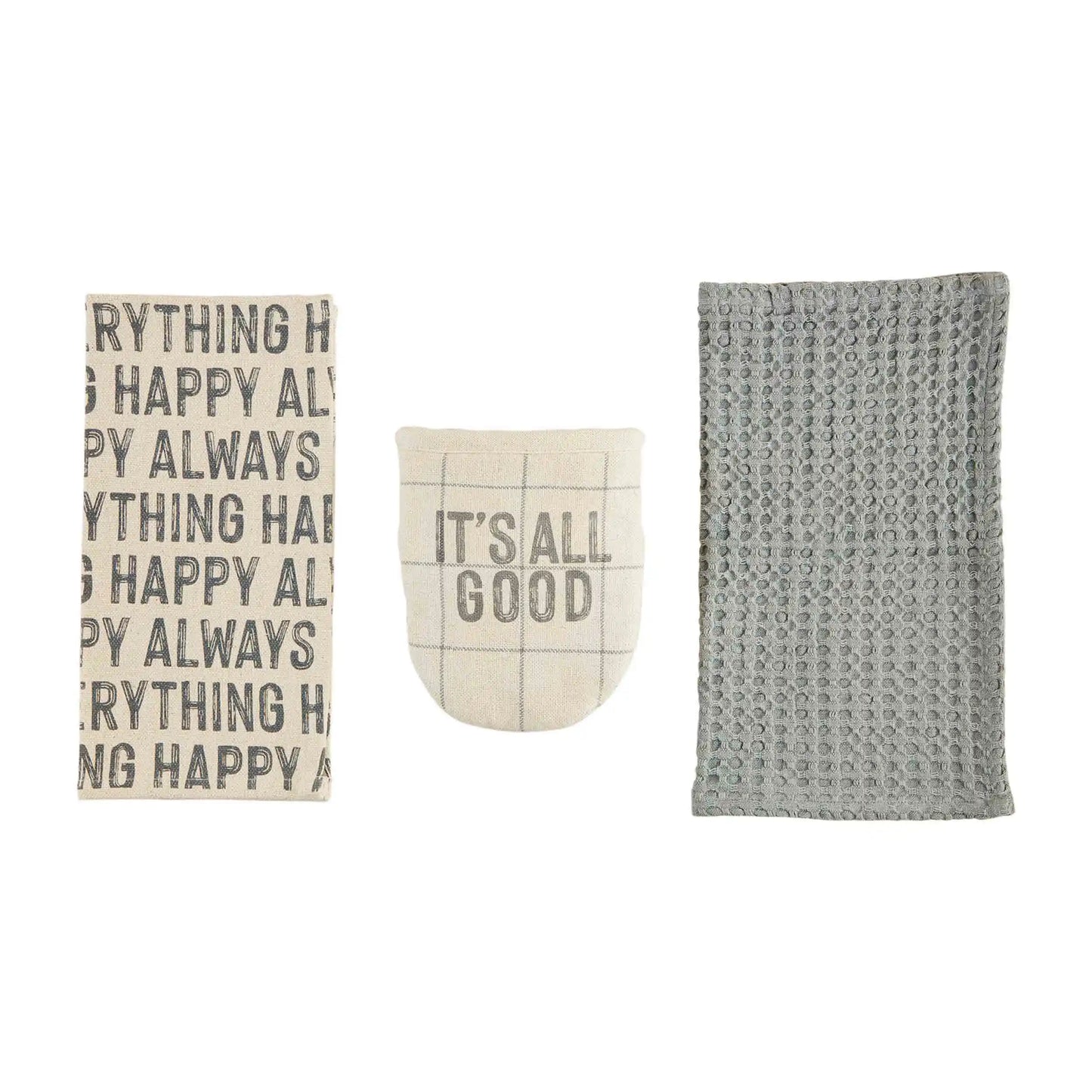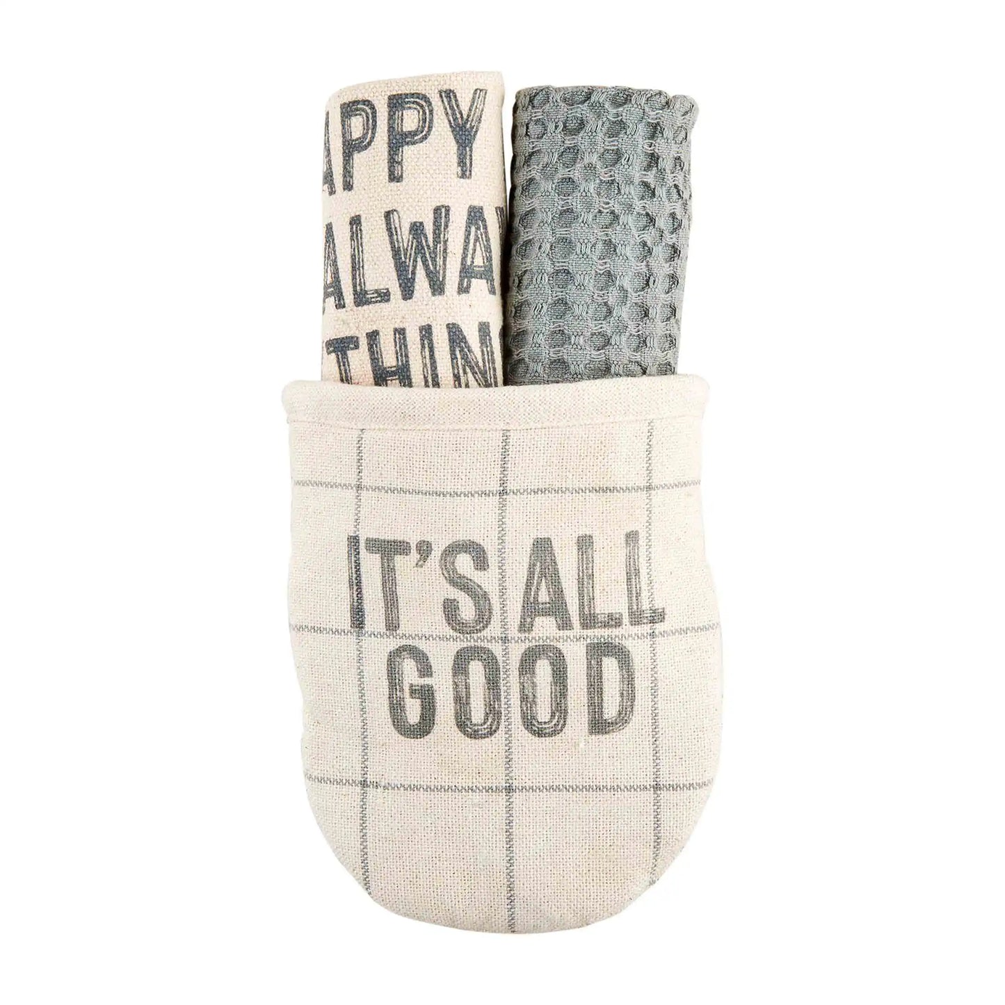 Whether you're looking for a housewarming gift, or apartment warming gift, you'll love this It's All Good Oven Mitt and Towel Set. The three piece set comes with a cotton oven mitt. The oven mitt comes with two woven cotton and waffle weave dish towels that feature unique patterns.