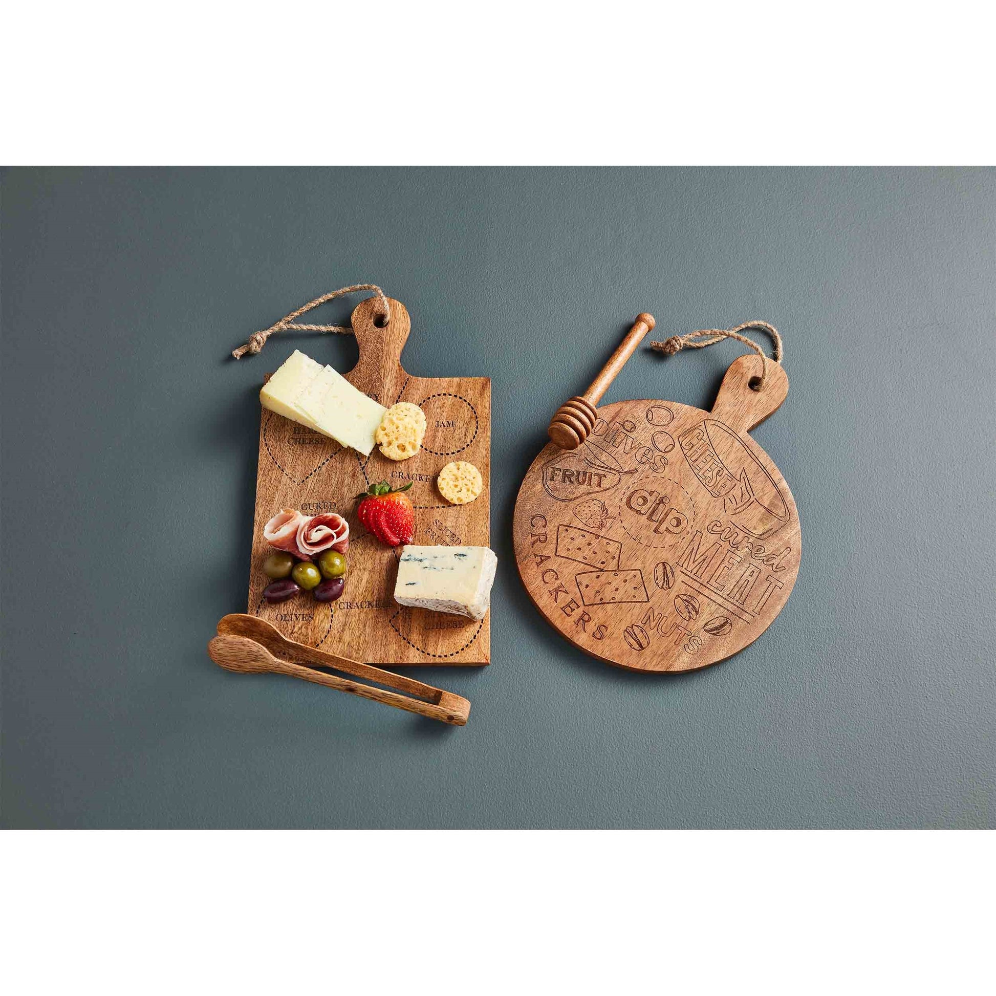 Our Round Mini Charcuterie Board Set is a no-stress serving board. The two piece set comes with an engraved mango wood paddle board. The board features sections for classic charcuterie toppings - fruit, meats, cheese, olives, nuts and crackers. The board comes with a honey dipper.