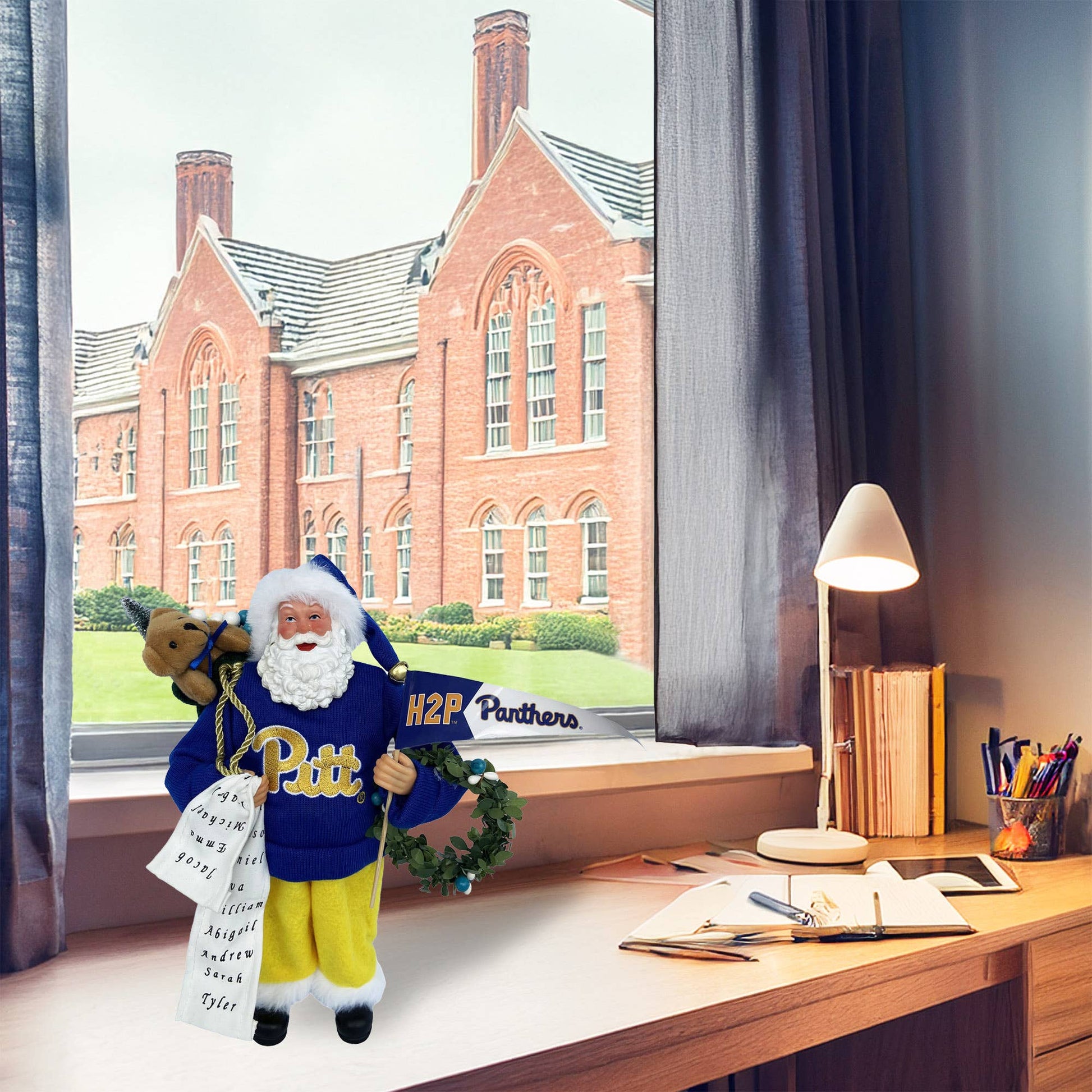 Has your team been good this year? Really good? Well, even if your favorite team didn't take the championship, Santa will make sure you have a perfect season! Wearing his favorite logoed sweater and toting a Christmas list, wreath, school pennant and big sack of goodies, Santa is ready to round up his reindeer and head to your town. Make the holiday season one to remember with this wonderfully handcrafted 12" Pitt Proud Santa.